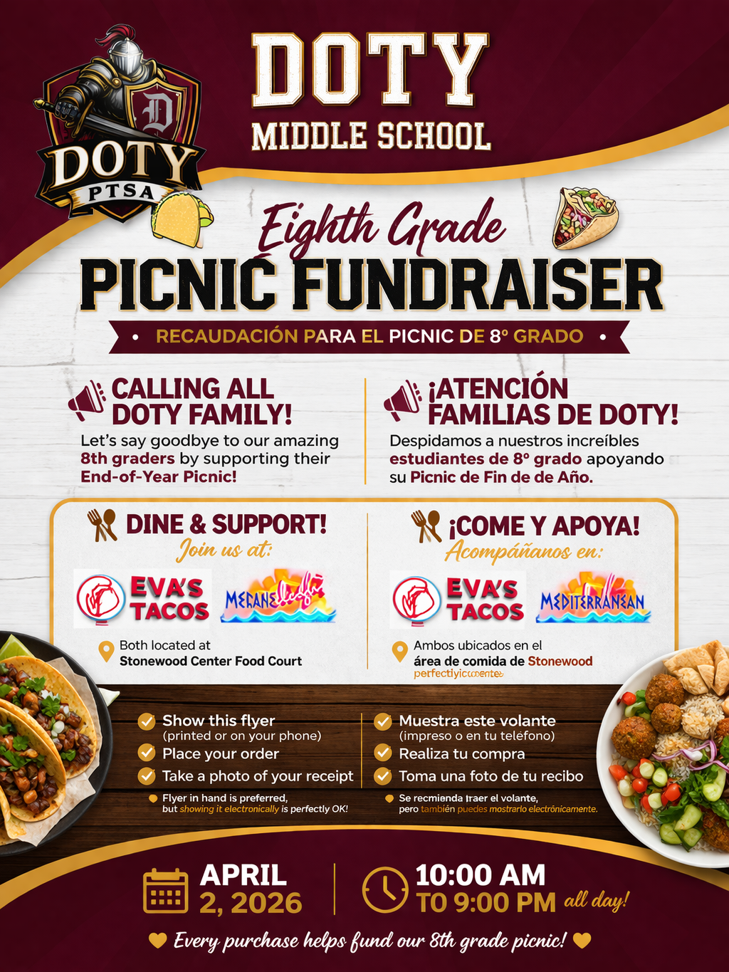 Support Doty Middle School end of year fundraiser on Thursday, April 2nd from 10am-9pm at Eva's Tacos and Mediterranean Delight.