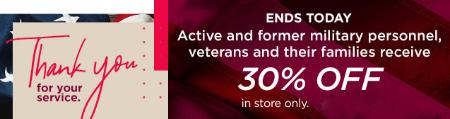 Hurry in and receive 30% off on active and former military personnel, veterans and their families in store for a limited time.