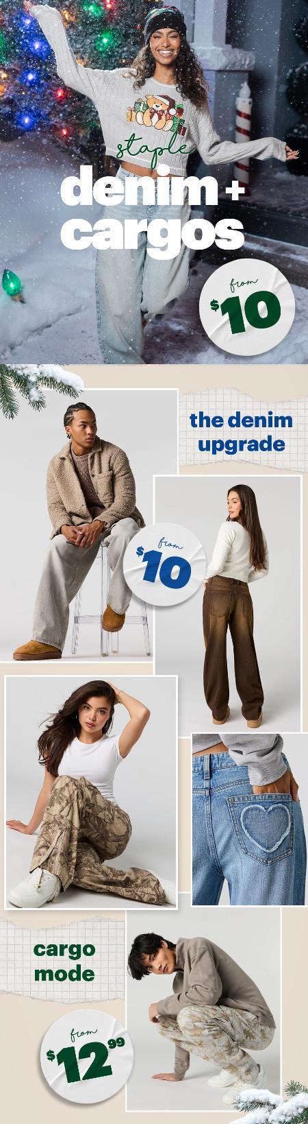Upgrade your lower half! Shop in store and get denim & cargos from $10.