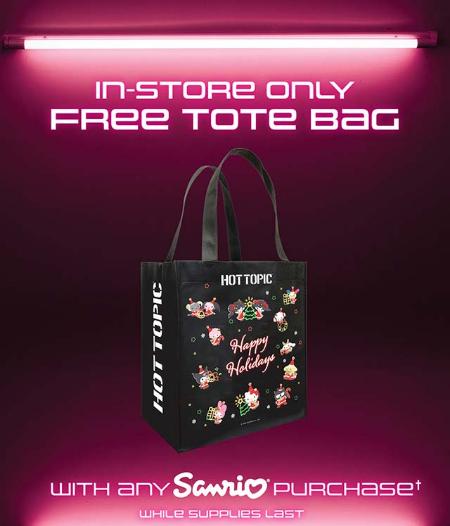 † FREE SANRIO TOTE GIFT WITH PURCHASE – Receive a free Sanrio Tote Bag (the “Gift”) with any purchase of a Sanrio item at select Hot Topic stores only on 12/20/2025. Offer available only in select Hot Topic stores, while supplies last. Limit one Gift per customer. Offer has no cash value and gift cannot be exchanged or redeemed for cash. See a Store Associate for details.