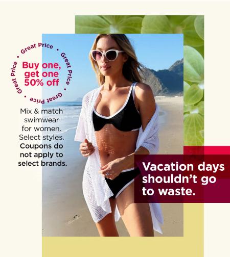 Shop in store and buy one, get one 50% off mix & match swimwear for women.